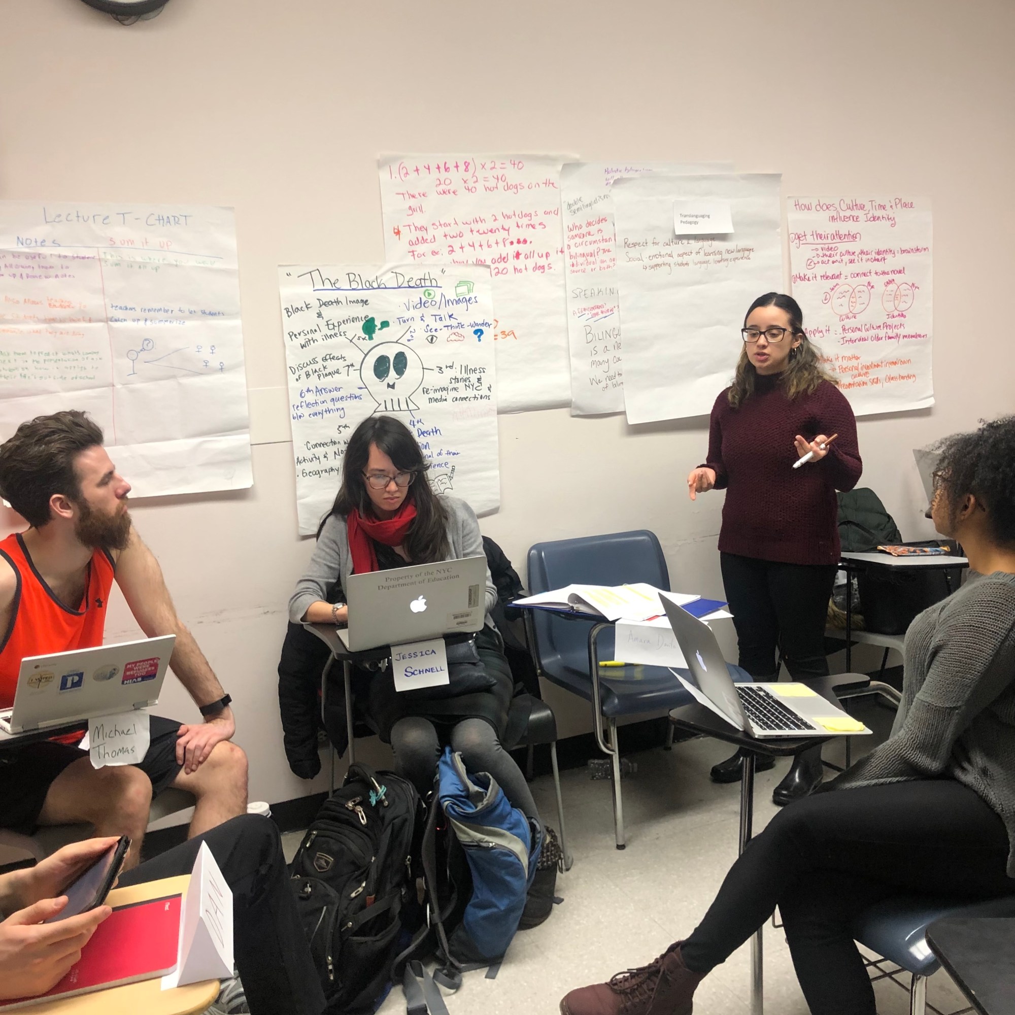 My classes are anchored in translanguaging and transtrauma pedagogical stances. A translanguaging stance encompasses the language practices and cultural understandings that students bring from home and communities, as well as from school. These practices and understandings co-exist, work juntos, and enrich each other. Students’ families and communities are valuable sources of knowledge and must be involved in the education process juntos. The classroom is a democratic space where teachers and students juntos create knowledge, challenge traditional hierarchies, and work toward a more just society (García, Johnson, & Seltzer, 2017: p. 104).